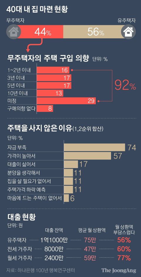 서울 등 대도시에 사는 40대 열 명 중 네 명꼴은 무주택자라는 설문조사 결과가 나왔다. 이들 중 92%는 내 집 마련을 꿈꾸고 있었다. 하지만 주택 마련을 위해 모으는 돈은 매달 36만원에 불과했다. 이런 속도의 저축으로 서울에서 중위가격 아파트(지난달 9억8667만원, KB국민은행 조사)를 산다고 가정하면 229년(2740개월)이 걸린다는 계산이다.