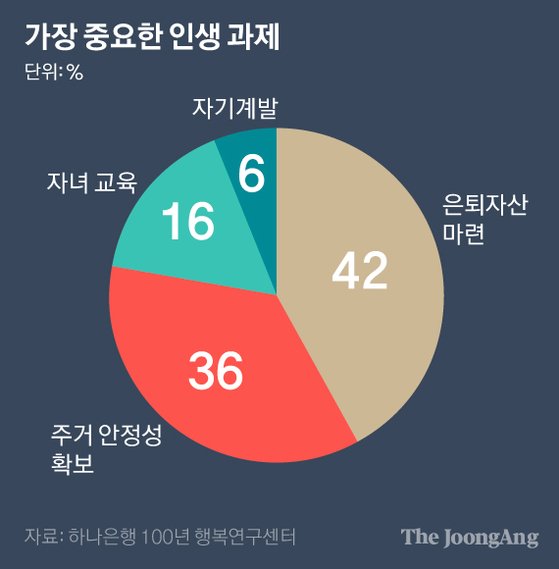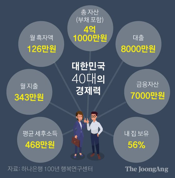 하나은행 100년 행복연구센터는 3일 ‘대한민국 40대가 사는 법’이란 제목의 보고서를 냈다. 여론조사업체인 한국리서치에 의뢰해 지난해 11월 서울과 지방 4대 광역시(부산·대구·대전·광주)의 40대 1000명을 대상으로 설문조사를 했다.